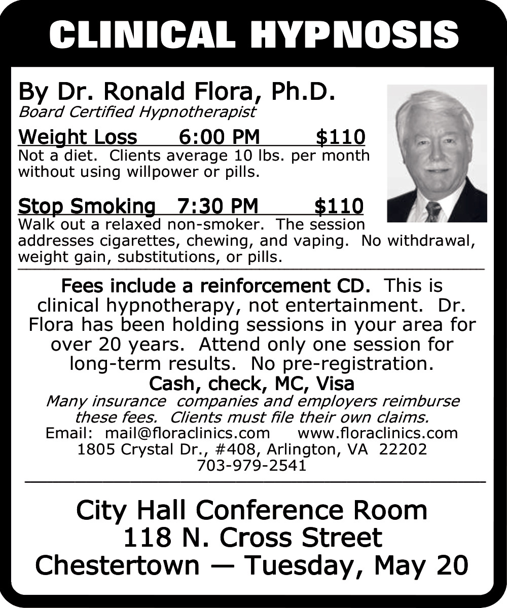Ads for Clinical Hypnosis by Dr. Ronald Flora, Ph.D. at the City Hall Conference Room / Chestertown in Chestertown, MD