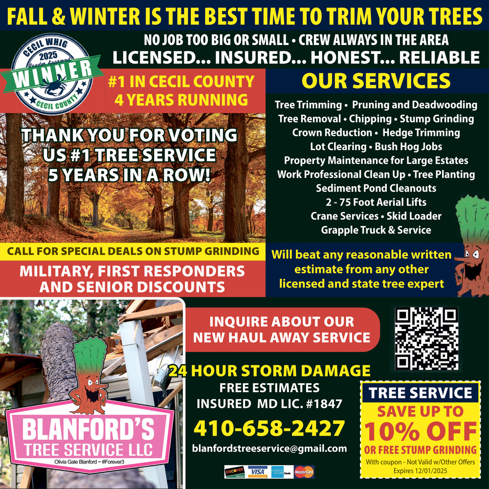 Oct 29, 2025. Blanford's Tree Service LLC Landscape Ads from Cecil Whig