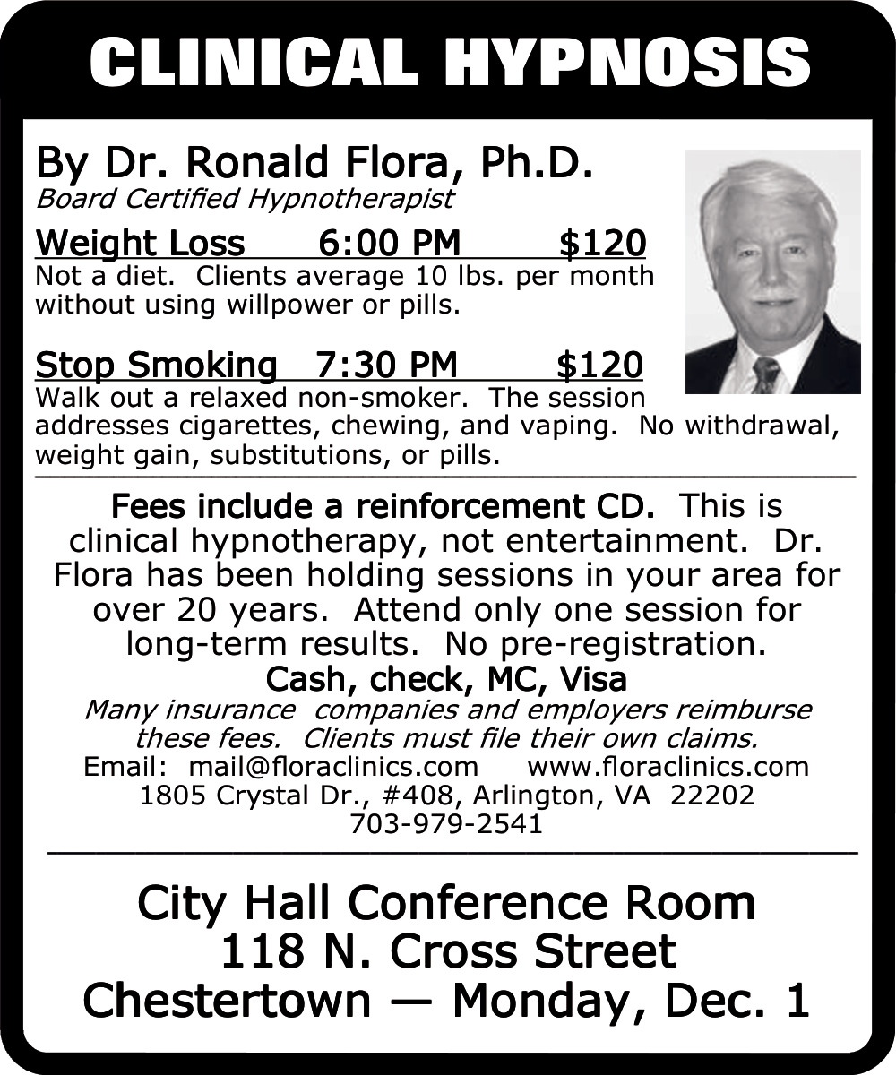 Nov 27, 2025. Clinical Hypnosis by Dr. Ronald Flora, Ph.D. at the City Hall Conference Room / Chestertown Events Ads from Kent County News