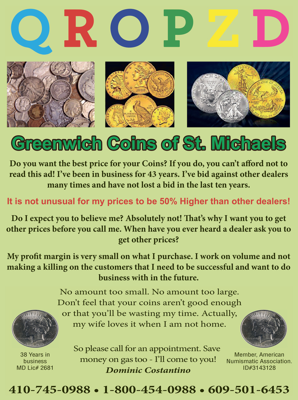 410-745-0988409 Bentley AveSaint Michaels, MD 21663(Greenwich Coins of St. Michaels)