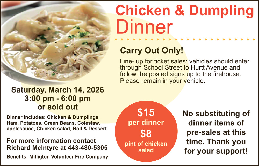 Mar 05, 2026. Chicken & Dumpling Dinner - Millington Volunteer Fire Company Fundraisers Ads from Kent County News